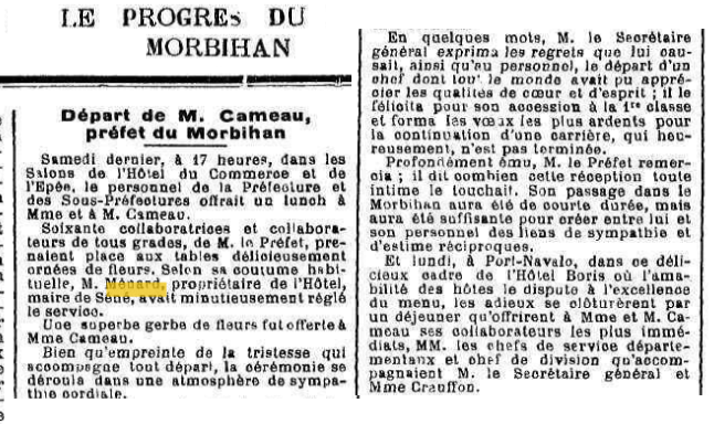 On y apprend que le marie de Séné est bien Henri MENARD, qu'il est aussi propriétaire de l'Hôtel du Commerce et de l'Epée à Vannes rue du Mené. C'est une personnalité locale, un notable qui accueille dans son établissement la cérémonie pour le départ du Prefet. Cette information est corroborée par un autre article de presse daté de juillet 1937 qu nous apprend que l'hôtelier a fait faillite et nous donne le nom de son épouse Germaine Louise BRIARD.