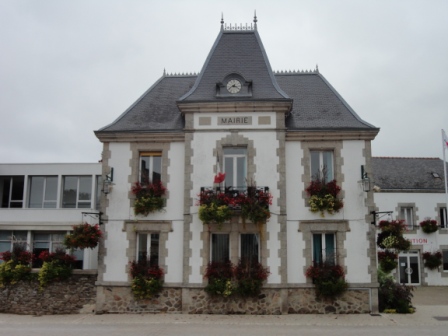 Sur cette photo, une réunion de marins devant la mairie.On reconnait le bâtiment avec ses contours de fenêtres et de portes en briques. On dicerne l'entrée de la cour à droite. Sur cette vue aérienne des années 1950, on reconnait les deux batiments des écoles de filles et de garçons avec la cour séparative et la petite mairie. Le plan de 1920 ci-après, confirme l'implantation de la mairie, place Coffornic jusqu'en 1928.