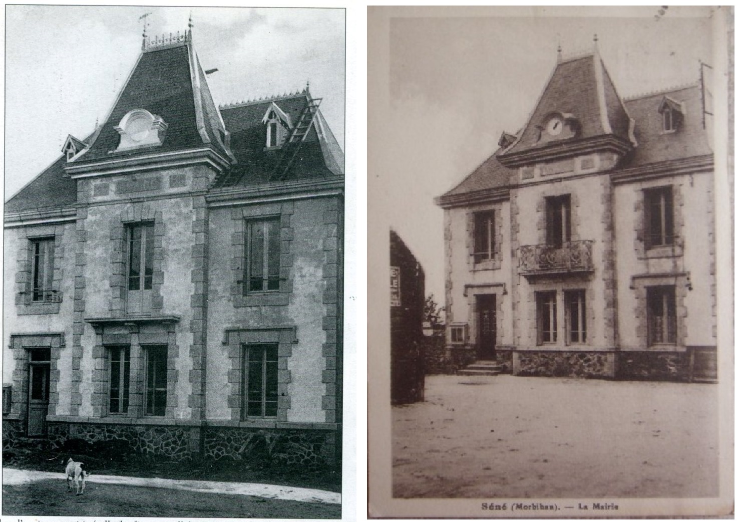 Ces deux vues de l'ancienne mairie de Séné datent respectivement de 1928 et 1941. Entre ces 2 dates, l'édifice a été doté d'une horloge et d'un beau balcon en fer forgé. Dans le bulletin municipal de décembre 1990, avant l'agrandissement de la mairie, tel que nous la connaissons aujourd'hui, un historique avait été dressé par Vincent Le Franc, conseiller municipal qui resta en poste de 1947 à 1997.