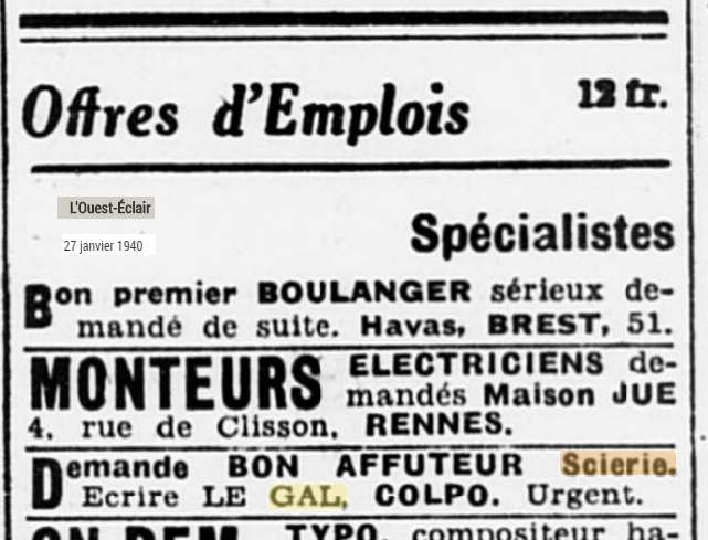 Cette annonce paru en 1940, indique que son atelier se situe toujours à Colpo pendant la guerre. A la Libération, la ligne de chemin de fer dite d'intérêt secondaire est arrêtée vers 1948. La famille LE GAL s'installe donc à Vannes, rue de Verdun au plus près du port d'exportation et d'importation de bois car la produciton bretonne de bois ne suffit pas. A Vannes, aidé de son fils, il va développer l'activité de sa scierie. Au début des années 1950, à l'étroit à Vannes, comme beaucoup d'entreprises à l'époque, il déménage et s'implante à Séné sur un terrain route de Nantes. Lucien LE GAL se marie en 1954 avec Odette ROUXEL, la fille du transporteur de Vannes.