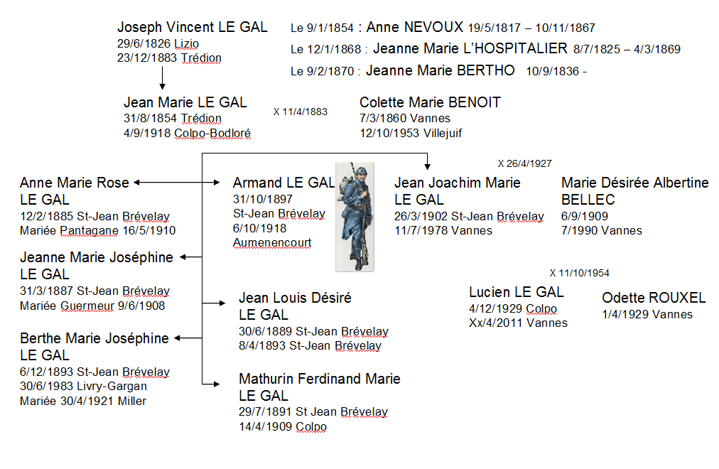 La famille LE GAL est originaire du Lizio et de Trédion comme nous le montre cette petite généalogie. Tout bascule au début du siècle dernier. Jean Marie LE GAL [31/8/1854-4/9/1918] déclare l'activté de couvreur le jour de son mariage, comme avant lui son père Joseph Vincent. Marié à Colette BENOIT, les époux perdent leur premier garçon, Jean Louis, à l'âge de 3 ans. Alors qu'ils sont installés sur Colpo, ils perdent leur 2° garçon, Mathurin, couvreur de son métier, à l'âge de 17 ans. La guerre survient. Jean Marie LE GAL décède en septembre 1918 à Colpo et quelques semaines plus tard, Armand, leur 3° garçon, également couvreur, décède sur le front de Champagne, lors de combat du 95° Régiment d'Infanterie à Aumenancourt. Son corps repose au cimetière militaire de Somepy-Tahure. Son nom a été rajouté au Monument aux Morts de Colpo, en 2018 à l'occasion du Centenaire.