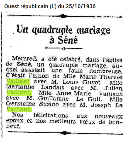 Sa fille unique Andrée [9/7/1921 Lanouée - 23/10/2021 Coubert 77] reviendra dans les années 2010 à Séné en pélerinage sur les lieux de son enfance. Elle a été accueillie dans par le gérant du restaurant Ar Gouelen, maison qui était alors le siège de la poste à Séné. Sur cette photo l'écriteau au dessus de la porte: POSTES SENE TELEGRAPHES-TELEPHONES
