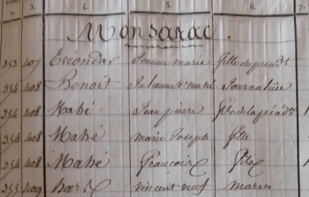 Mme Benoit est journalière à La Garenne, son mari Sylvestre est décédé et elle élève seule 3 enfants. Son aîné Jean-Pierre MAHE né le 13/09/1817 va partir accomplir sa conscription dans la marine. Avec les autres marins de la corvette Dordogne, il prendra possession au nom du Roi des Français, de l'île de Nossybé près de Madagascar.(Lire le récit de son exploration en pages Marins de Séné).