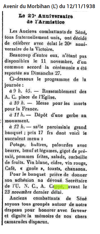 Le 11 novembre 1937, Aimé CAPPE organise la cérémonie du 11 novembre qui se finit par un repas chez Mlle Robino.