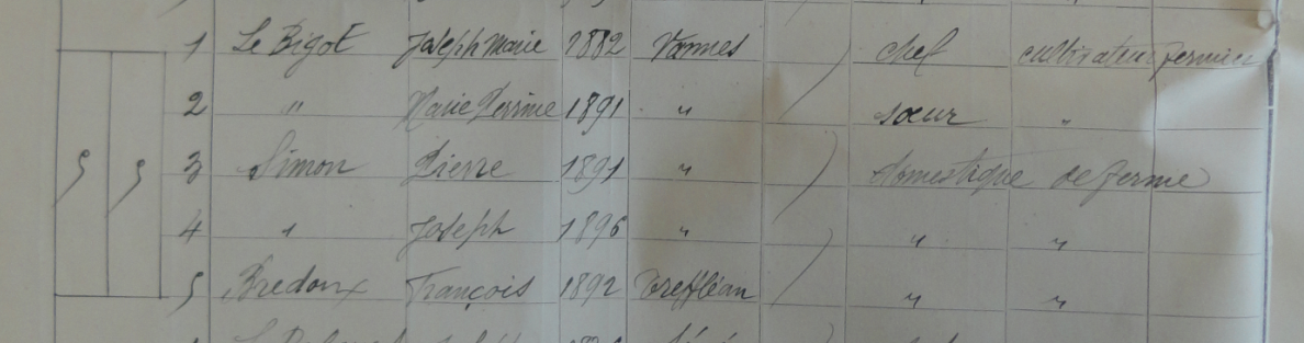 On le retrouve au dénombrement de 1911 comme domestique de ferme chez les "le Bigot" à Kernipitur. Ainsi Bredoux connaissait-il esl frères Le Bigot François Marie et Jean Marie également sur le front.