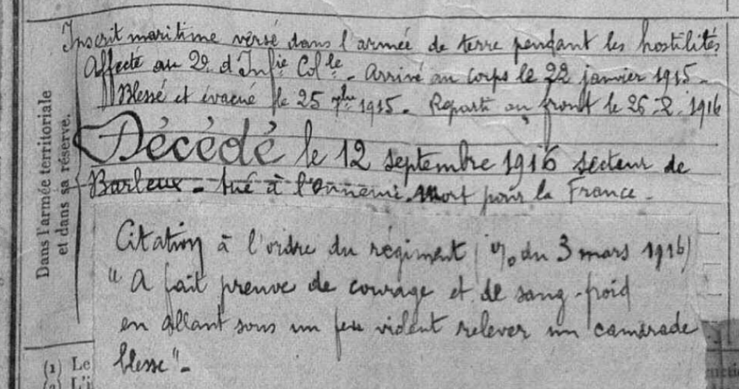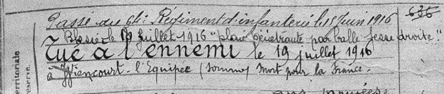 Cette même fiche de matricule nous indique qu'il est engagé volontaire pour aller combattre. Il intègre le 65°RI le 9 février 1916. Il est tué par balle au combat à Vauxaillon le 30 mars 1917, la vaille des ses 20 ans.