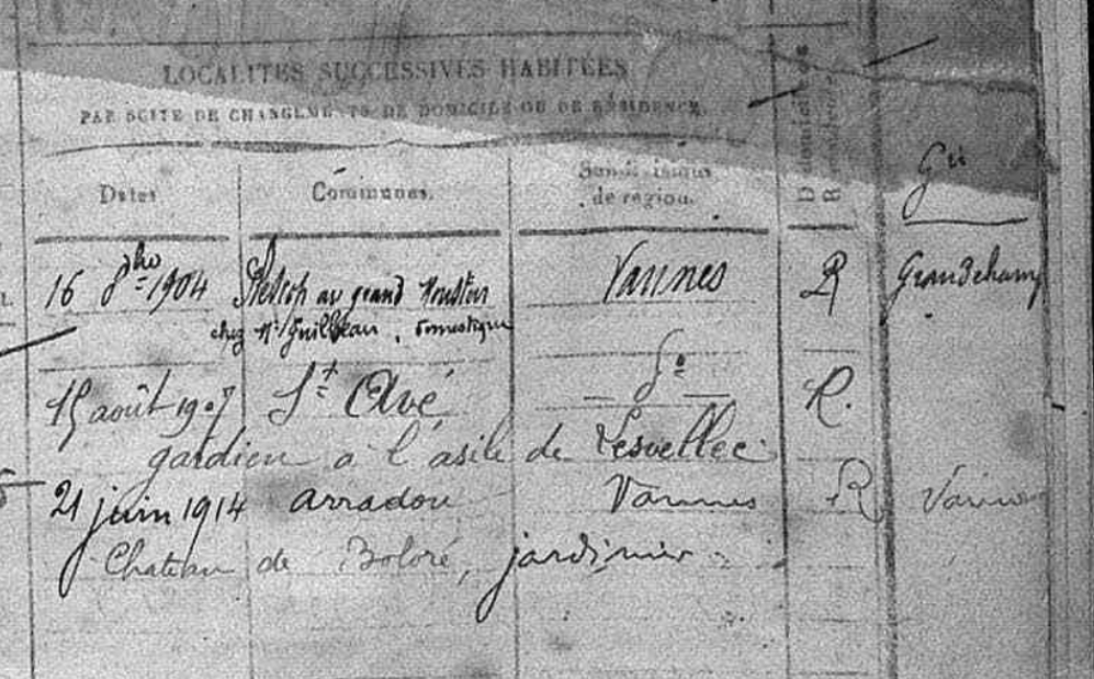 A l'âge de la conscription en 1912, il déclare que son père est décédé et la profession de domestique. Lui et sa mère résident à Séné.