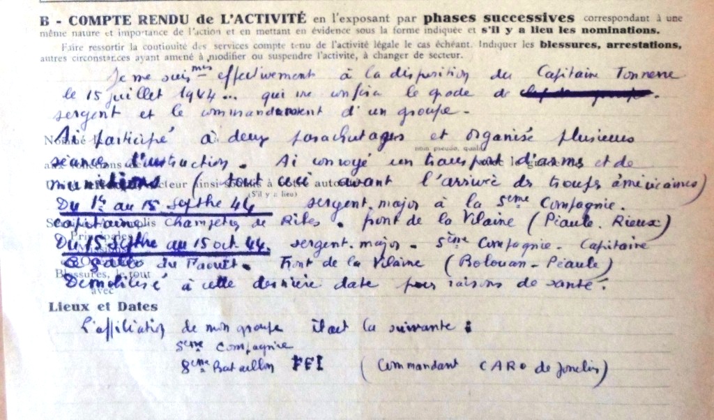 Comme l'atteste cette pièce à son dossier, il rejoint le 1er Bataillon du Capitaine Gougaud. Il prend part au combat à Botségalo, puis dans le bois de Florange, à Plescop, à Saint-Avé, au Polygone et jusqu'à la libération de Vannes les 4-5 août 1944. Il poursuit avec son bataillon les combats sur le front de la Vilaine. Le 10/12/1944 il s'engage dans le 10° RAD, 4° groupe. Il continue la poursuite des armées allemandes et la libération du pays. Il est démobilisé le 12/10/1945 et rentre sur Vannes.