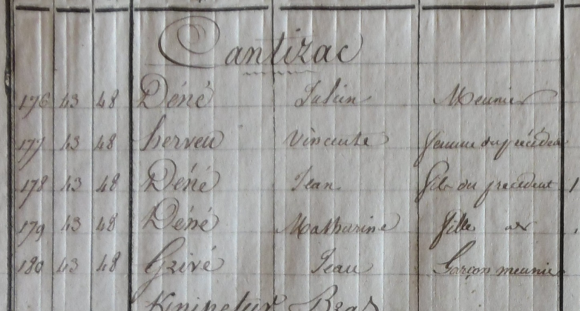 Lors du dénombrement de 1841, Julien DENE déclare l'activité de meunier à Cantizac et emploie un garçon meunier. La consultation des tables décennales et des sites de genealogie permet de retrouver l'acte de décès de Julien DESNE à Séné Cantizac le 2/07/1855. Il a marié sa fille Mathurine Anne [19/08/1817 Plumelec - 2/03/1878 Le Hézo] à un meunier du Hézo en 1848. Il a enterré son fils Jean [28/11/1824 Plaudren - 8/07/1854 Limoges, transcrit à Séné] alors incorporé dans le 5° régiment des hussard à Limoges.